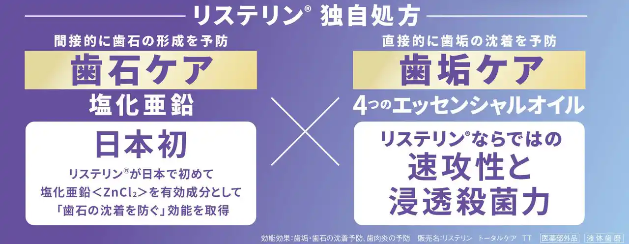 *1 歯石の沈着を防ぐ塩化亜鉛と、歯垢の沈着を予防するエッセンシャルオイル(チモール、L-メントール、1,8-シネオー ル、サリチル酸メチル)の組み合わせがオーラルケアカテゴリーにおいて日本唯一(当社独自調査及びMintel GNPDに よる当社調べ 2025年6月) |