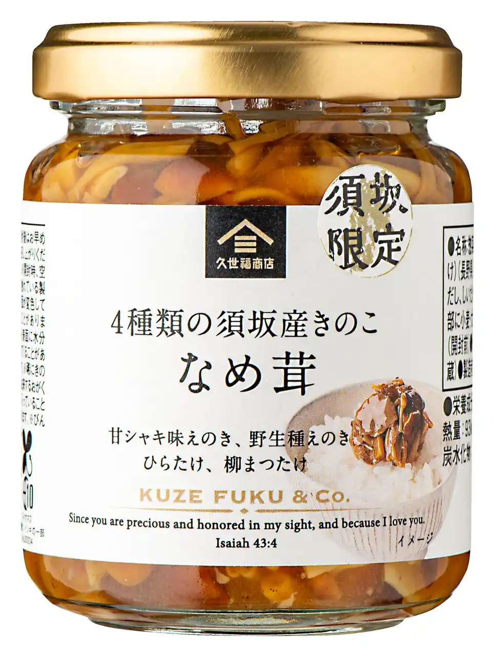 2種類のえのき、ひらたけ、やなぎまつたけ、須坂産のきのこ4種類を贅沢に使用。きのこの存在感がしっかり残った新食感なめ茸。 |