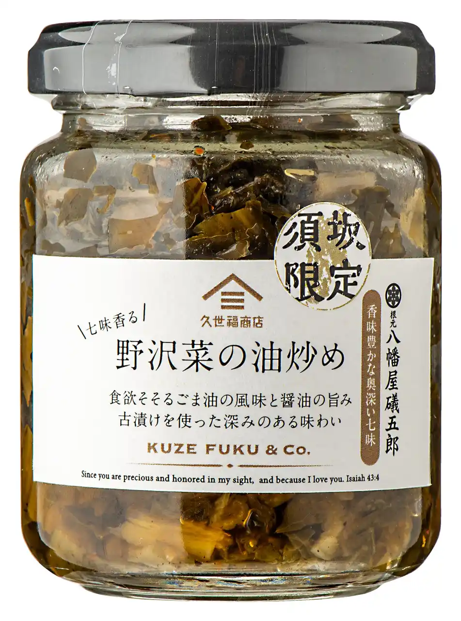 信州の郷土料理「野沢菜の油炒め」に信州の老舗「八幡屋礒五郎」の風味良い七味を加えた、ごま油の香ばしさと醤油の旨みが効いた逸品です。 |