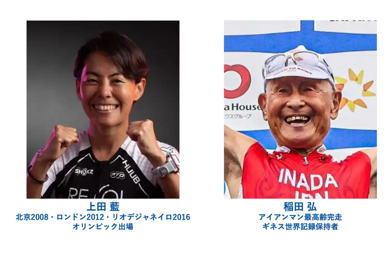 | オリンピックに3大会連続出場の上田藍選手と、90歳を超えてなお現役で挑戦を続ける世界最高齢のトライアスリート稲田弘選手が、子供たちのチャレンジを応援します。 | |||