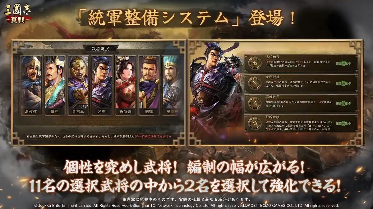 | 新システム「統軍整備」が登場。統軍武将の設置によって対応する強化効果を獲得できます。各武将はそれぞれ4つの異なる強化特性を持っています。スキルの組み合わせによってシナリオ限定の編制が可能になり、戦力を大幅に上げることができます。 | |||||||||