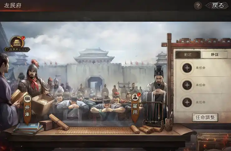 | 左民府では人材を雇用し、静謀や動匠に任命できます。任命するとマップで動匠指令を実行できます。指定する動匠効果を選択して有効化すると、強化効果を獲得できます。さらに、他の人材を消費して静謀や動匠のランクアップを行えば、強化効果が増幅し、プレイヤーを多方面でサポートしてくれます。 | |||||||||