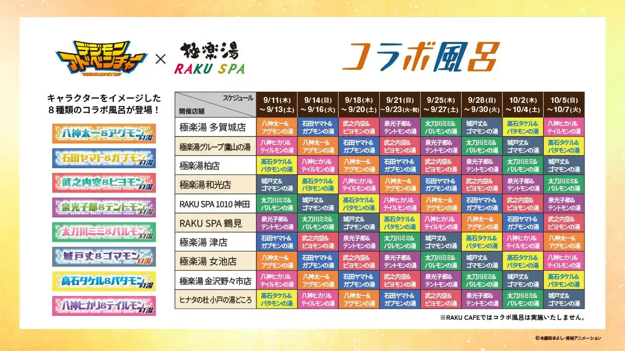 『デジモンアドベンチャー』×極楽湯・RAKU SPAコラボキャンペーン“~ごくらくアドベンチャー~”が、全国11店舗にて9月11日(木)より開催決定! |