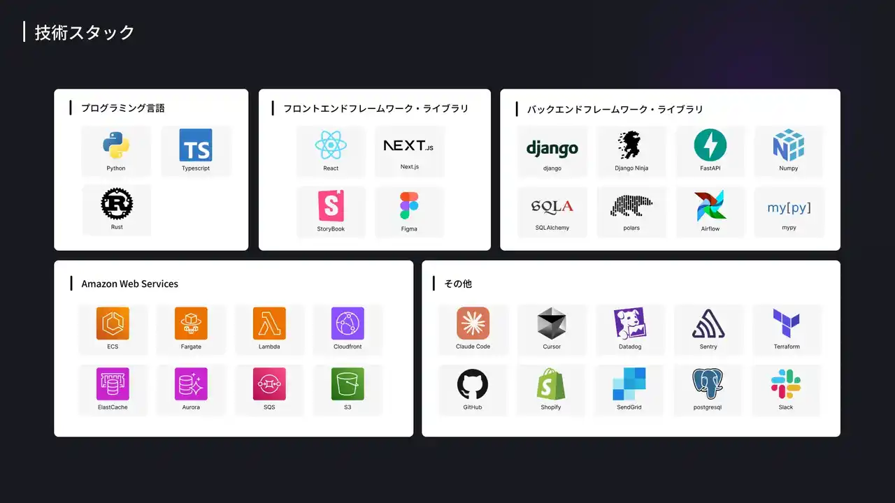 | 今回の受賞は、私たちの開発速度と組織の生産性が客観的に高く評価された結果です。Recustomerの開発組織は現在10名の小規模なチームですが、そのうち5名がPyConJP 2025に登壇するなど、社内外で積極的に活動しています。 | |||