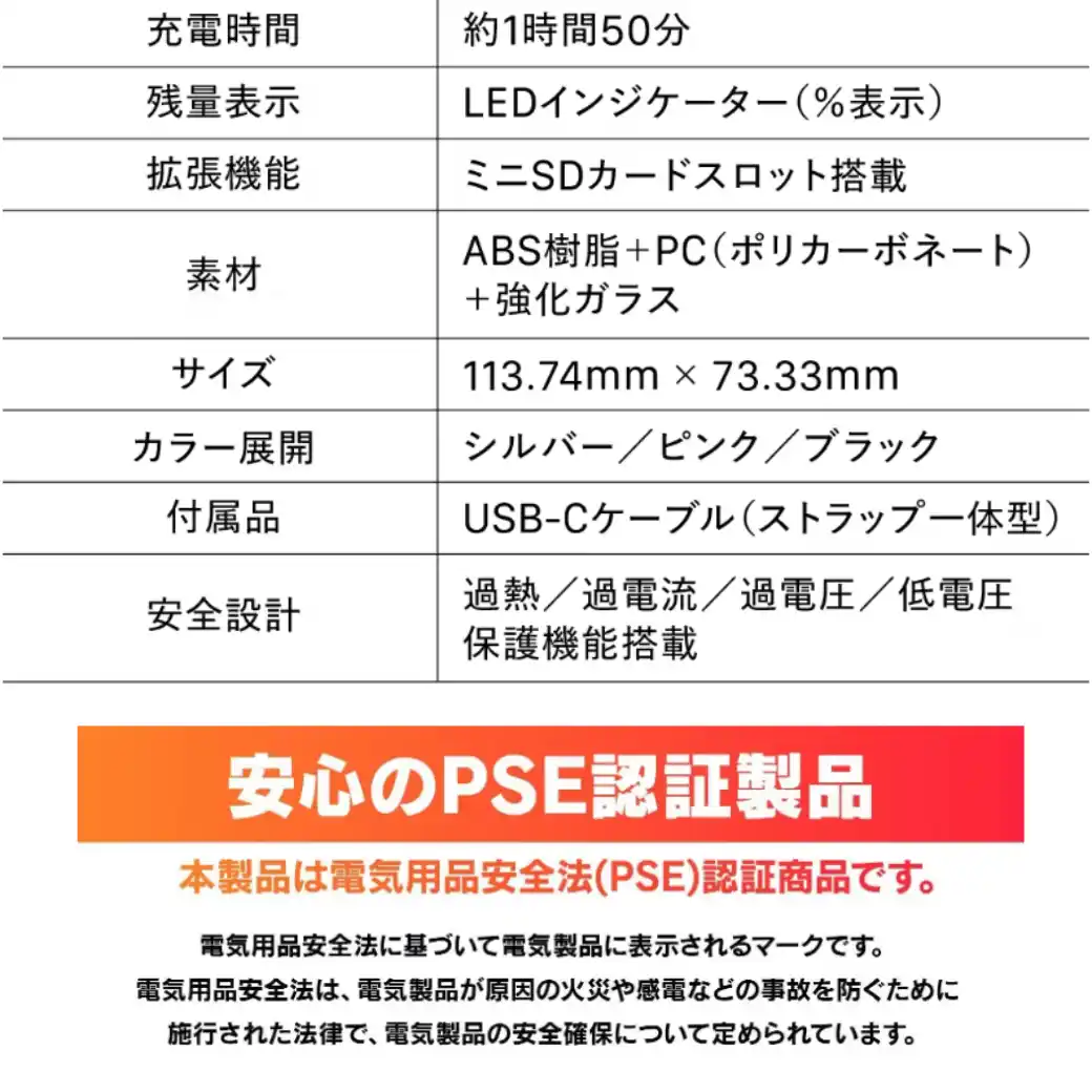 バッテリー容量:5000mAh(iPhoneなら1回分のフル充電も可能) |