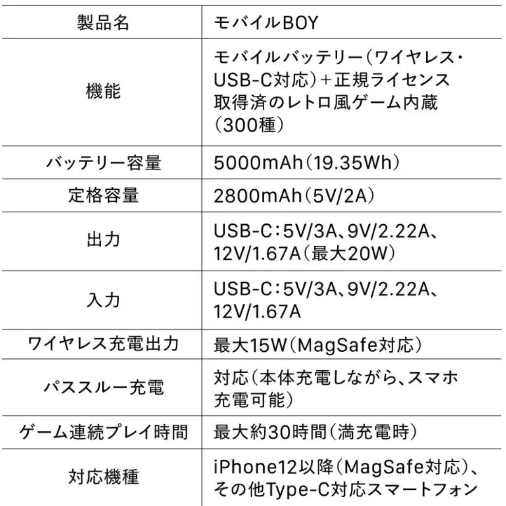 300種類のレトロ風ゲームを本体に内蔵。スマホ充電はもちろん、ちょっとしたスキマ時間にネット不要のゲームでリフレッシュできる、新感覚モバイルバッテリーです。軽量・コンパクトで持ち歩きにも最適。かわいい見た目と意外なスペックで、大人も子どもも夢中に! |