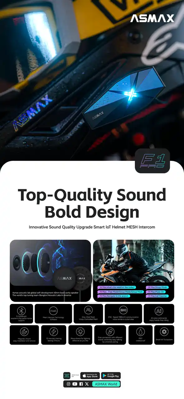 ASMAX F1 Proは、日常のソロライドから10人以上のマスツーリングまでカバーするオールラウンド・メッシュ通信インカムです。 |