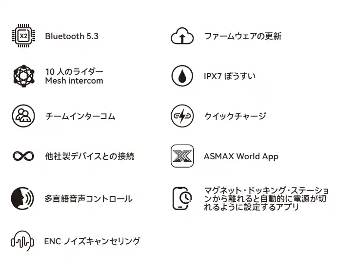 ASMAX F1 Proは、メッシュ通信対応・高音質スピーカー・音声操作・IPX7防水・専用アプリ対応など、ハイエンドモデルに求められる機能をすべて搭載しながら、市場価格の“半額水準”という革新的なプライスを実現。 ライダーにとって「迷ったらこれを選べば間違いない」と言える、次世代インカムの決定版です。 |