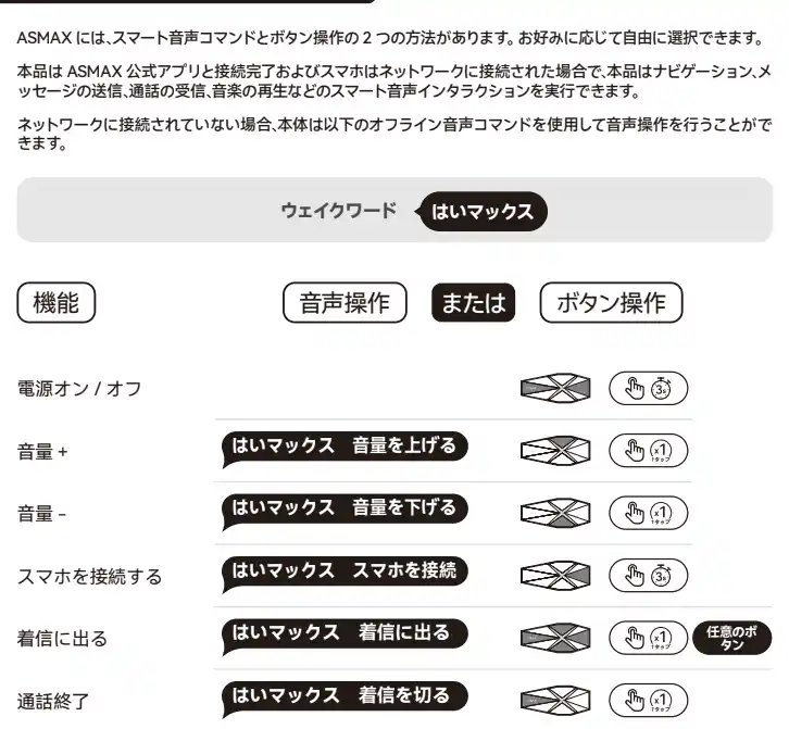 操作インターフェース 物理ボタン/音声コマンド/専用アプリ「ASMAX WORLD」で直感的に操作 |