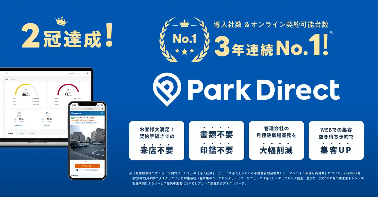 「Park Direct(パークダイレクト)」(https://www.park-direct.jp)は、駐車場にまつわるあらゆる業務(集客・契約・決済・顧客管理)を一気通貫でデジタル化するモビリティSaaSです。月極駐車場の各種手続き(※3)を全てオンラインで完結させ、不動産会社様や借主様の駐車場契約・管理にまつわるアナログなプロセスを大幅に削減します。さらに、駐車場ごとのデータに基づきオンライン/オフラインを問わない様々な集客施策を設計、展開し、月極駐車場の稼働率アップ、オーナー様の収益アップに貢献いたします。 |