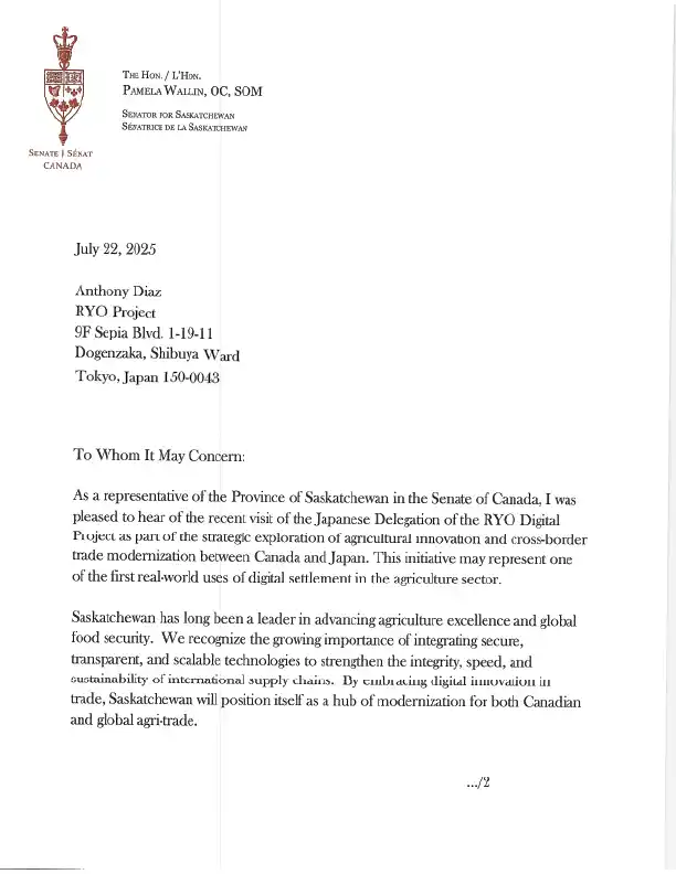 カナダ上院におけるサスカチュワン州の代表として、このたび、カナダと日本の間における農業イノベーションおよび国境を越えた貿易の近代化に関する戦略的な探求の一環として、RYOデジタルプロジェクトの日本代表団が来訪されたことを大変嬉しく思います。本取り組みは、農業分野におけるデジタル決済の実世界での活用の先駆けとなることでしょう。 |