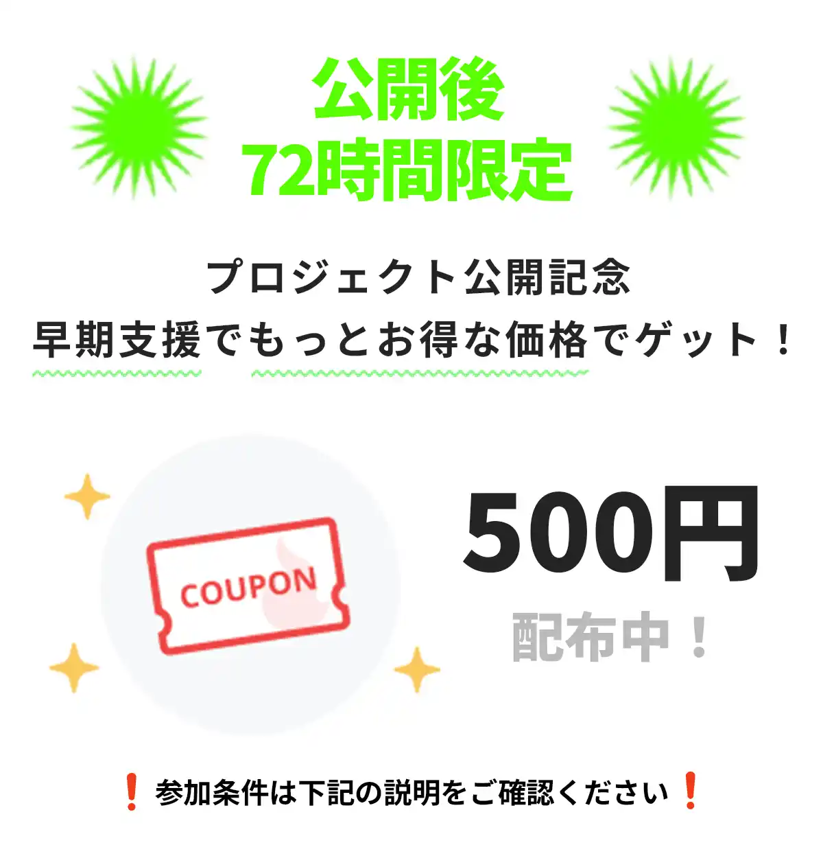 1️⃣公開後72時間限定 プロジェクト公開記念として、早期支援でもっとお得な価格でゲット! |