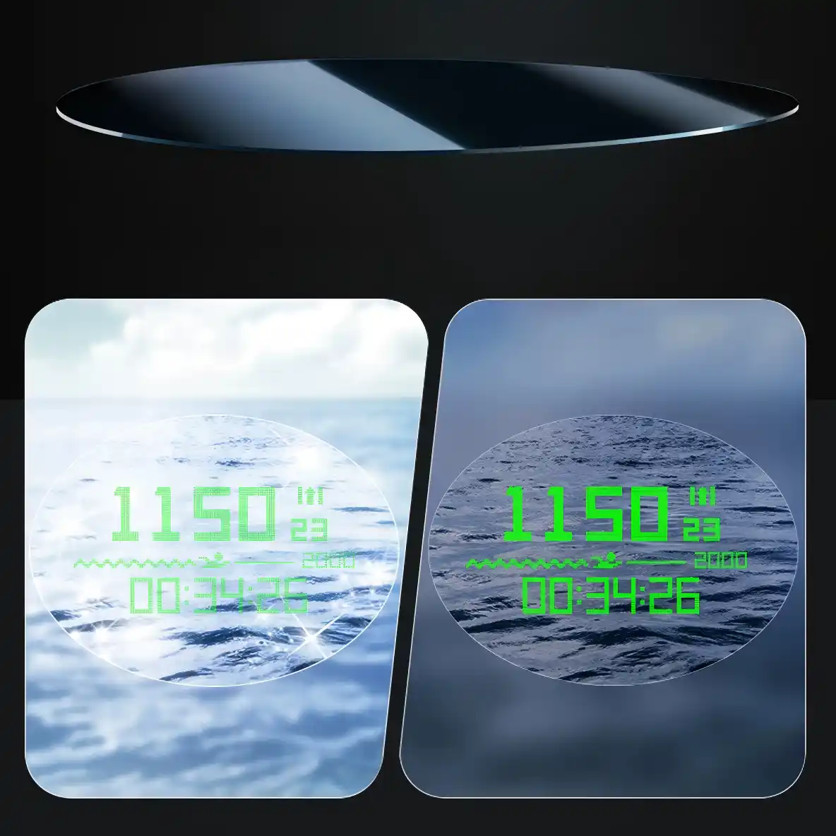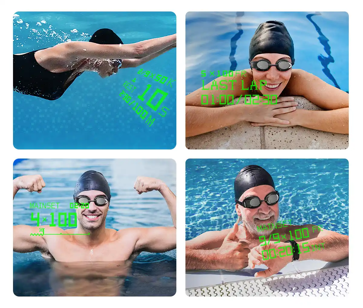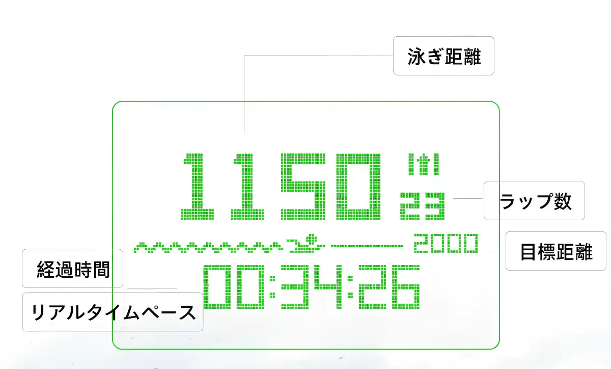 ・泳ぎながらリアルタイムデータ表示 (近視-6.0Dでもクリアな画面視認) |