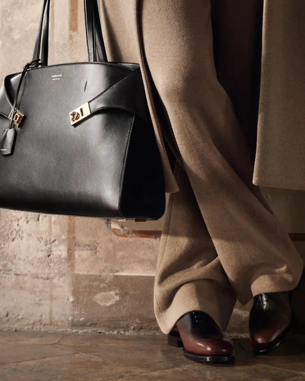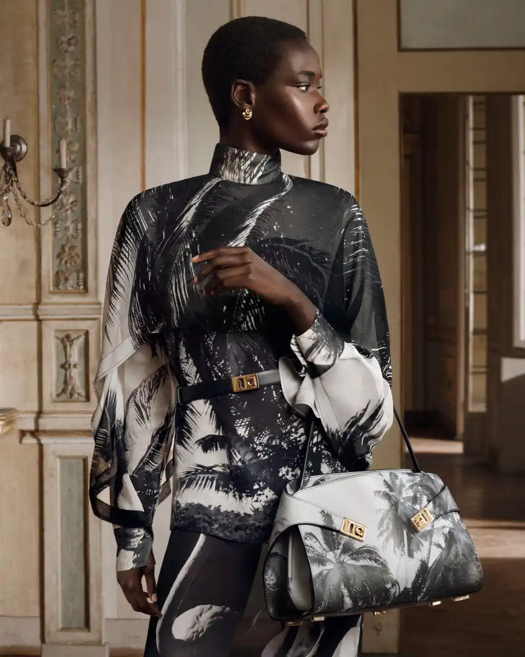 アーカイブのスタイルは現代的に再解釈され、アイコニックなリボンをまとった「ヴァラ」は洗練された光沢を放ちながら登場。メンズでは精緻な構造を誇る「トラメッザ」が、歴史ある職人技を現代的に讃える。さらに、新たなアイコン「ハグ」や「フェラガモ ソフトバッグ」も進化した姿で登場。パームプリントを施したモデルやファーを纏わせたデザインが、クラシシズムに夢幻的でシュルレアリスティックなひねりを加えている。 |