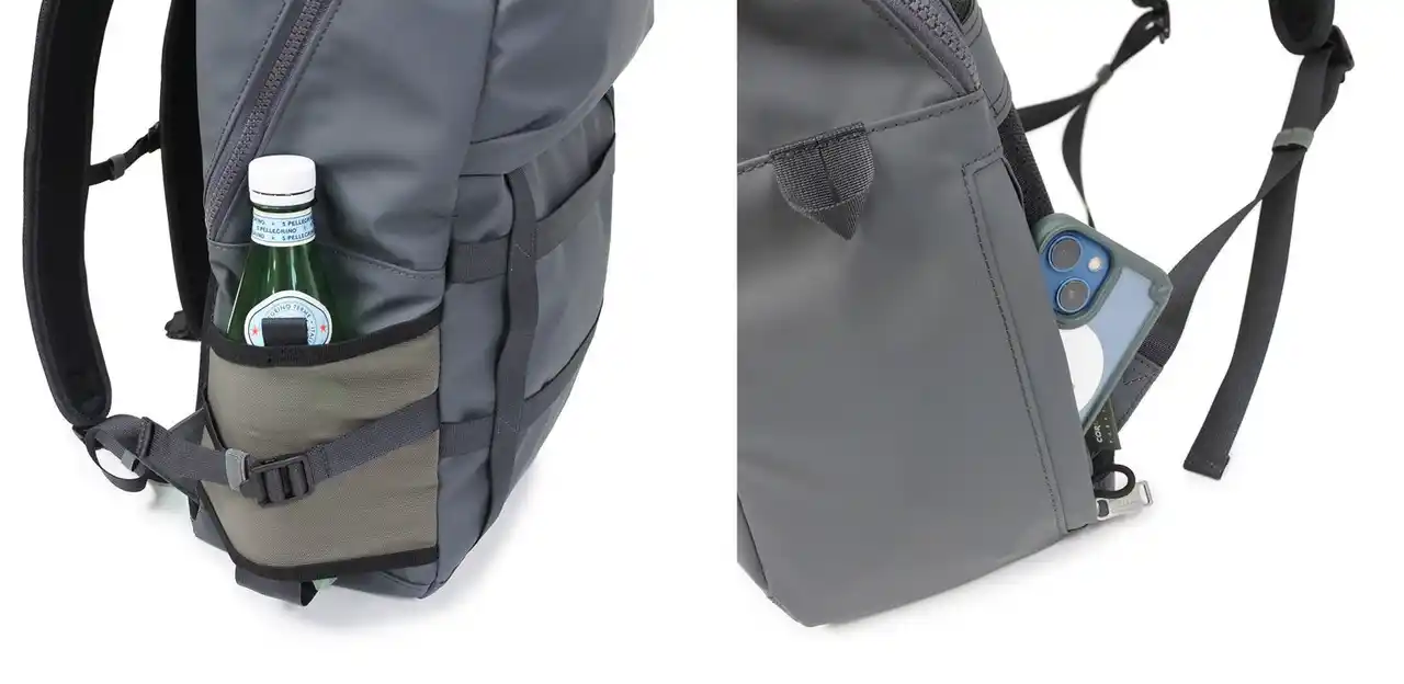 | 使いやすさもポイント。GRID-3 BACKPACK - 04 LIMITED EDITION - RAIN CAMO - は側面に伸縮性のあるメッシュポケットを配備。ペットボトルから大きめの水筒まで様々な形状のものを収納できます。本体は防水素材なので水滴でバッグの中身が濡れる心配もありません。反対側は、ファスナーポケットでスマホやICカードの収納に便利です。※画像は既存の型 GRID-3 BACKPACK - 04です。仕様は同様となります。 | |||