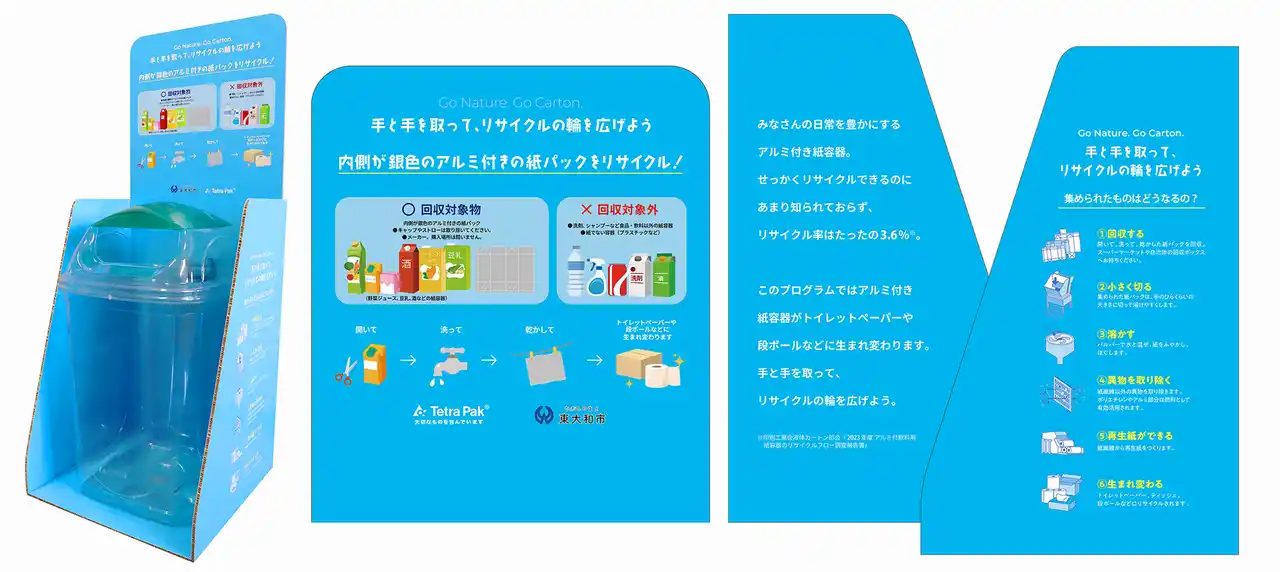 これにより、これまでリサイクルが難しいとされてきた飲料用アルミ付き紙パックが、資源として再利用される仕組みが始まります。同日から専用回収ボックスが東大和市役所1階本庁舎1階入口ロビーに設置され、市民の協力のもと循環型社会を目指します。 |