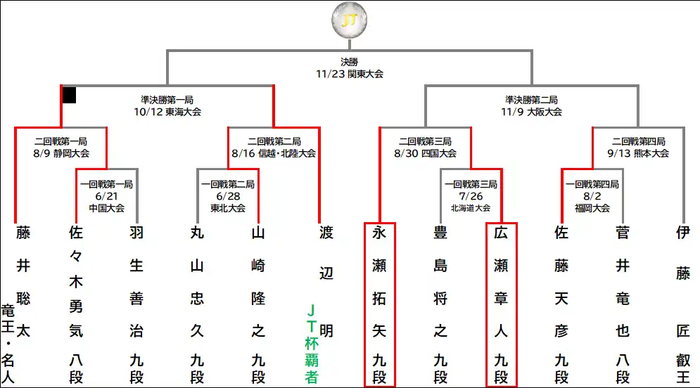 一回戦の豊島九段戦以降、他棋戦でも勝ち星を重ねて好調を維持する広瀬九段にとっては、直近4連敗中の永瀬九段戦は一つの山場といえるかもしれない。永瀬九段は今期、対藤井聡太竜王・名人との対局を除くと8割を超える高勝率で、多くの棋戦で挑戦者争いをしており、活躍は群を抜いている。好調な両者はともに「JT杯」準優勝経験者であり、初優勝へ向けて思いのこもった直接対決は、激しい展開が予想される注目の一戦だ。 |