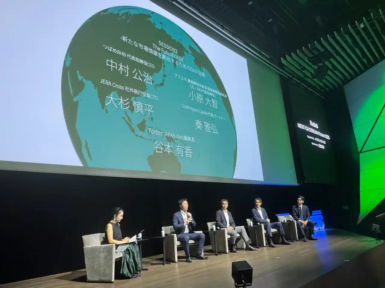 取締役CEO・中村 公治氏、GLIN Impact Capital代表パートナー・秦 雅弘氏、当社事業開発本部 新規事業開発部・小原 大智が登壇。GXを推進することで生まれる新たなビジネス機会について多角的に議論しました。 |