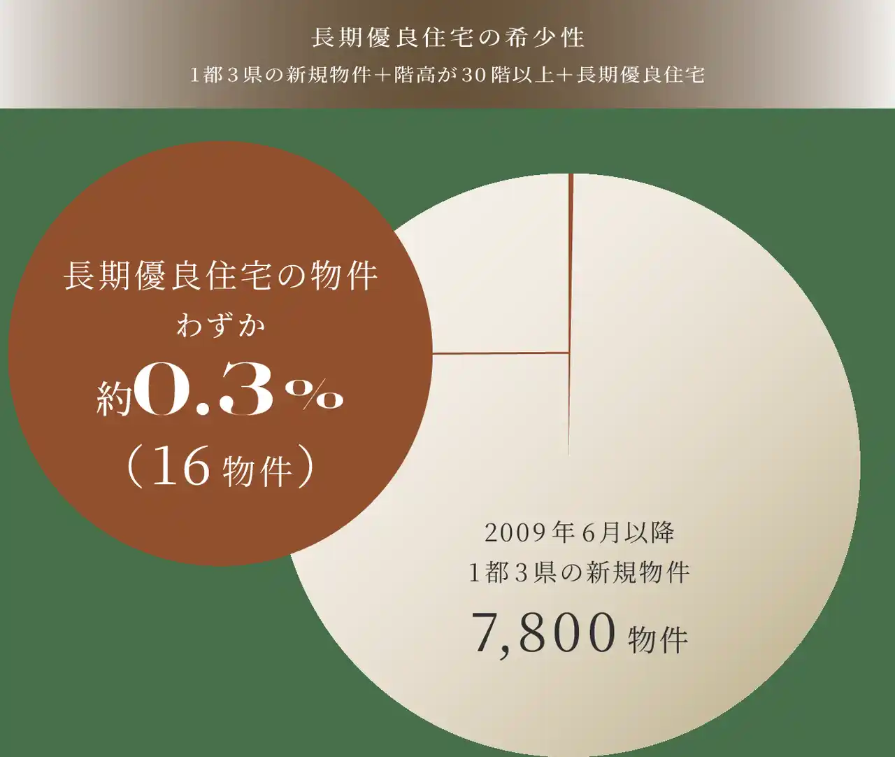 ※4 2009年6月以降に発売された1都3県の新規分譲マンションの中で、階高が30階以上かつ長期優良住宅の物件は7,800物件中16物件となります。対象期間2009年6月~2024年9月15日までのMRC調査・捕捉に基づくマンションデータによります(MRC・2024年10月号) |