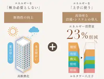 本物件は強化外皮基準(断熱性能)を満たし、省エネによる一次エネルギー消費量を基準値から20%以上削減(本計画では23%削減※5)を実現したマンションとして、「ZEH-M Oriented」基準を満たしました。 |