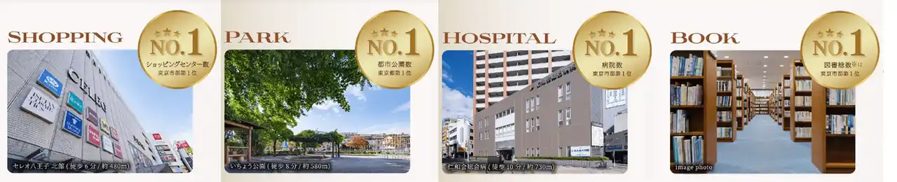 八王子市は、東京都内でショッピングセンター数※8・都市公園数※9・病院数※10・公立図書館の蔵書数※11すべてが第1位という生活利便性に優れた街です。通勤通学時はJR八王子駅・京王八王子駅の2駅4路線が利用可能で、東京・新宿・横浜へは乗り換えなしのダイレクトアクセスが叶います。さらに、本物件から中央自動車道「八王子IC」まで車で約5分と、週末のレジャーにも便利なカーアクセスを備えています。 |