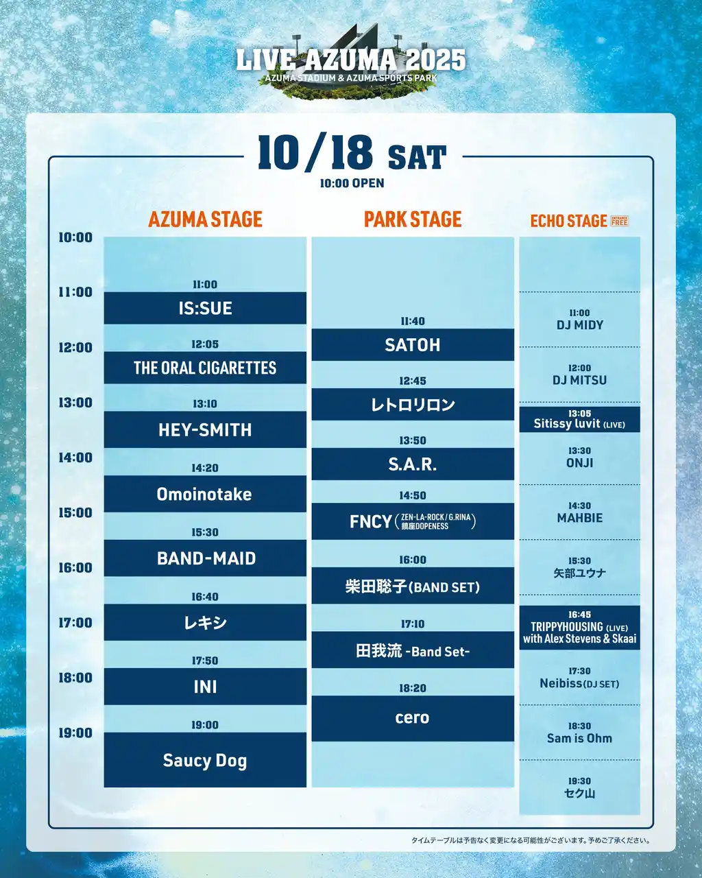 また、同時にタイムテーブルも発表となりました。AZUMA STAGEは18日(土)のトップバッター |
