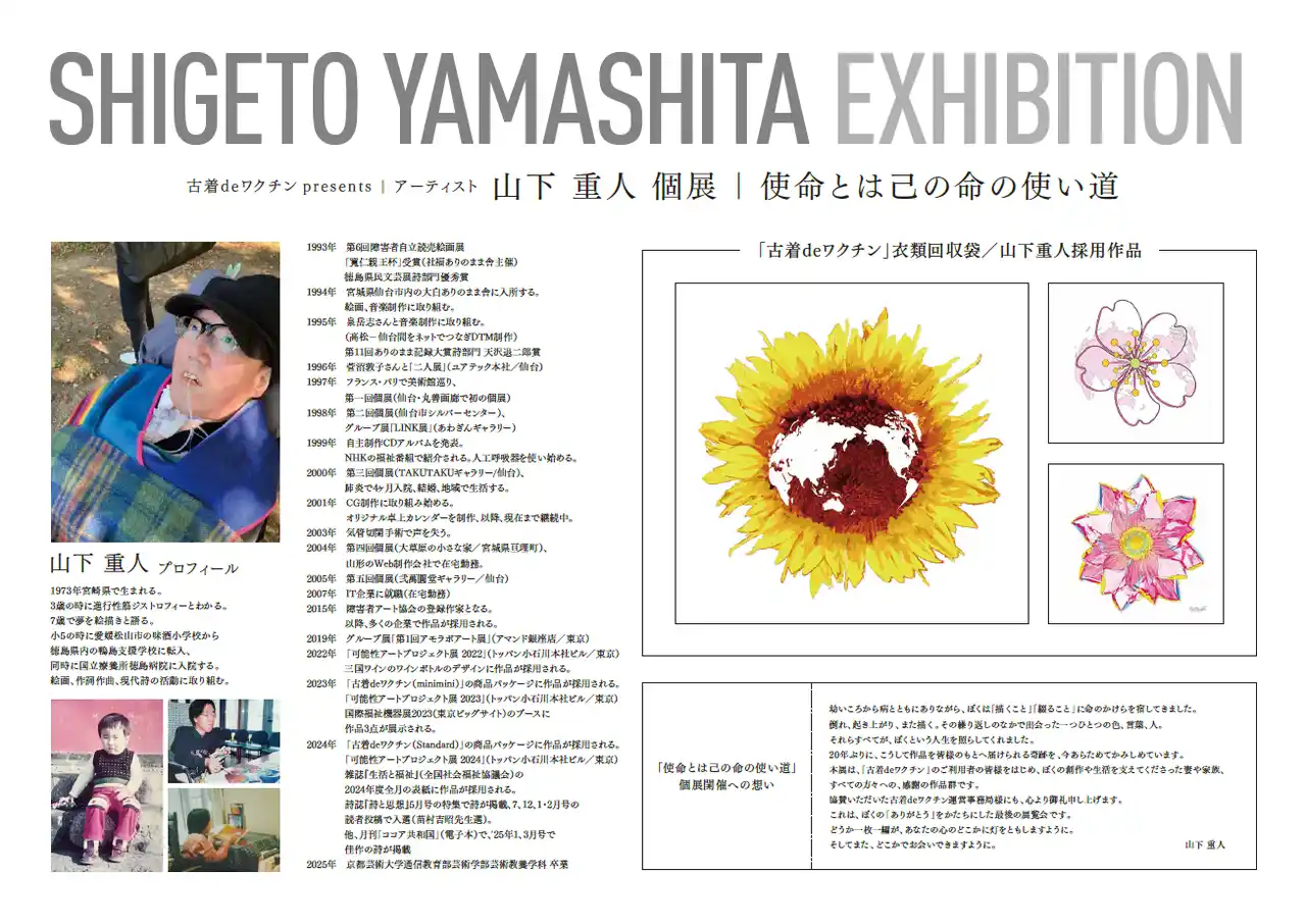 現在衣類回収袋「Standardサイズ」「MAXサイズ」で絵を採用させていただいておりますアーティスト山下重人さん、古着deワクチンのご利用者様のおかげでこの度、人生最後の夢であった個展を開催することとなりました。 |