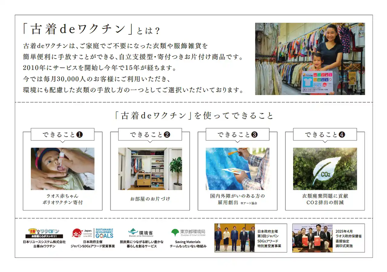 ご家庭でご不要になった衣類を簡単便利に手放すことができる有料の「自立支援型・寄付つきお片づけ商品」です。毎月約25,000人のお客様にご利用いただき、2010年の販売開始から累計 64,651,100着分の衣類を有効活用・9,122,110人分のポリオワクチン寄付をし開発途上国の子ども達の命を救いました。(2025/7/31現在) |