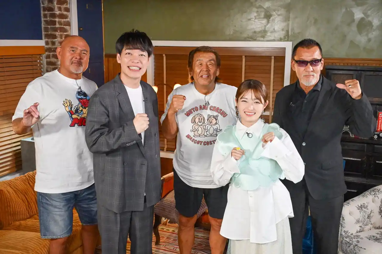 スタジオには、川島明(麒麟)、井上咲楽に加え、プロレス界のレジェンドである長州力、武藤敬司、蝶野正洋という異色のメンバーが集結! |
