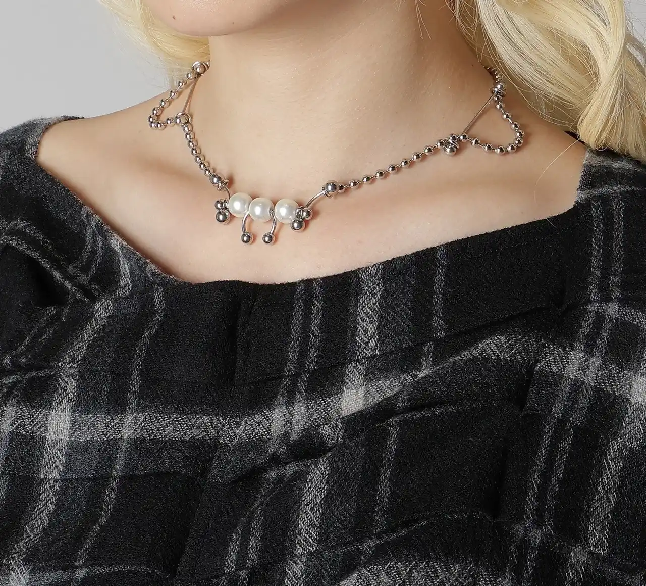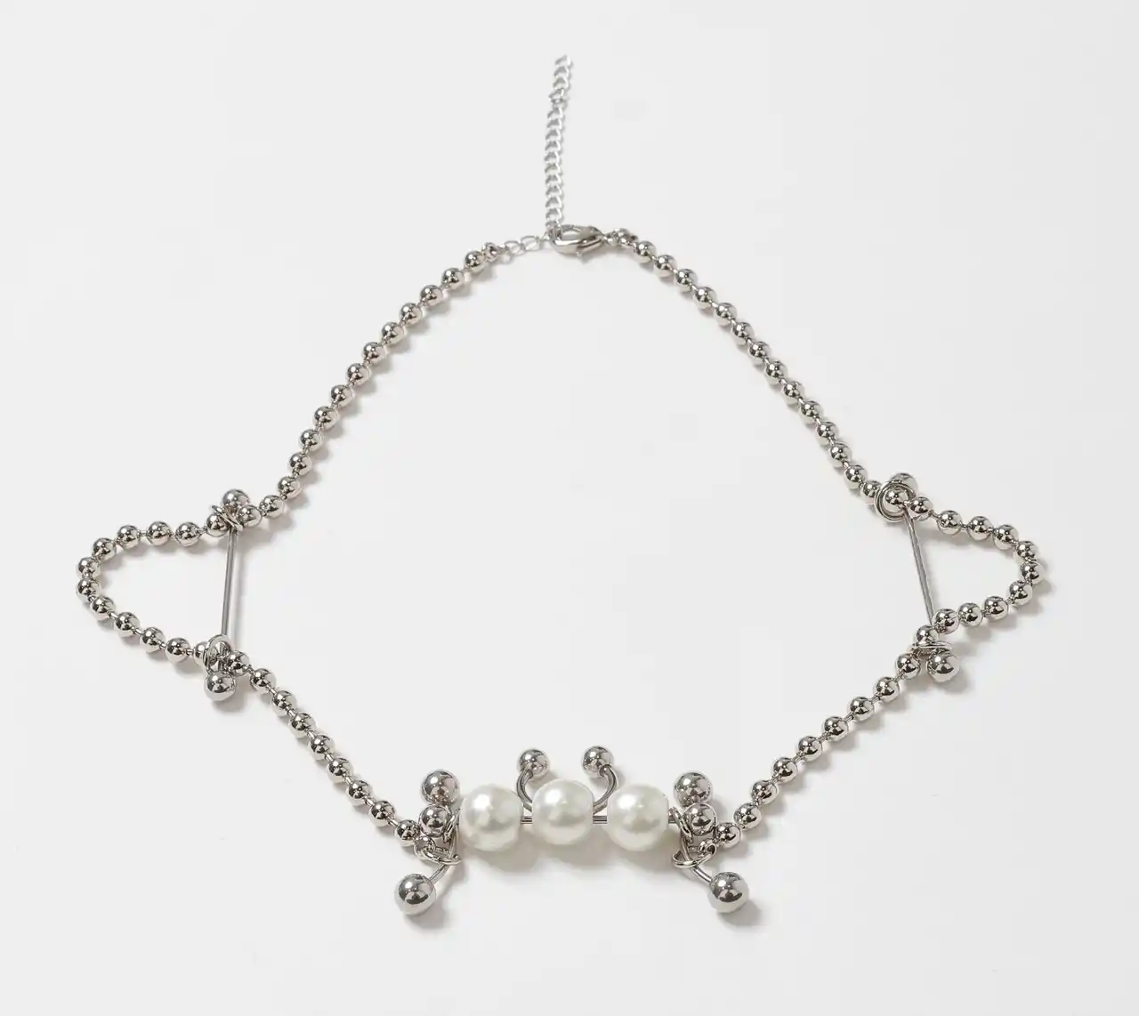 ボールチェーンとボディピアスの組み合わせ、中央に3連パールとボディピアスの通し付け、合金 |