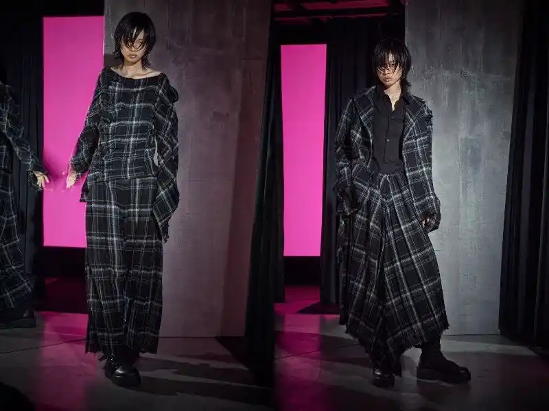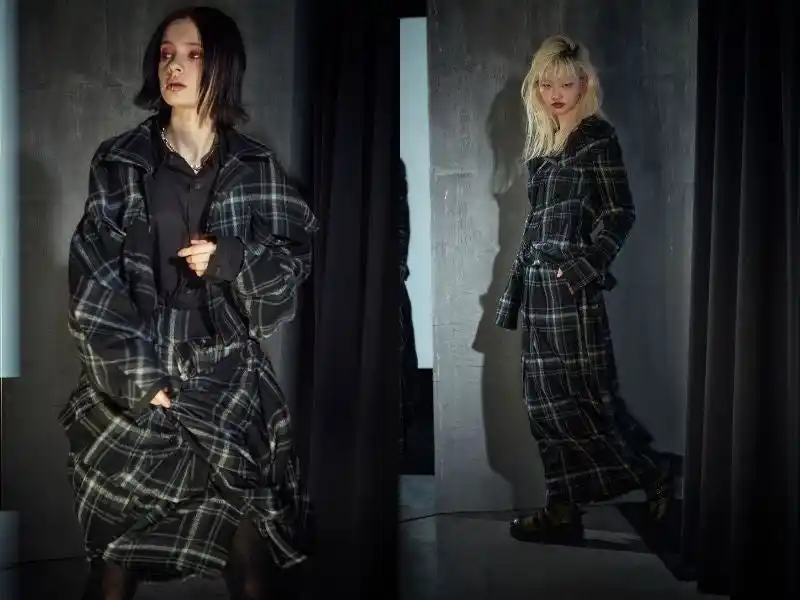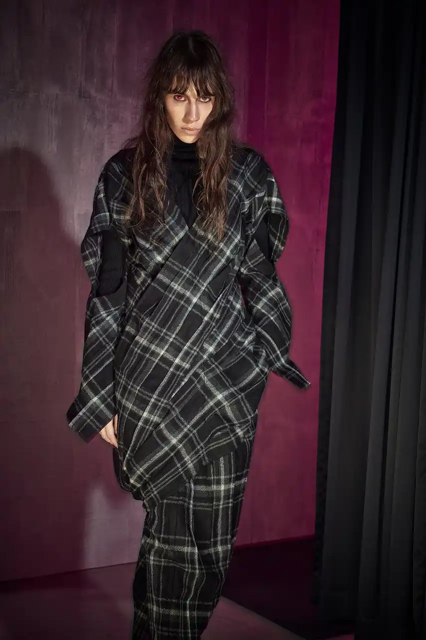 ジャケットとスカートが一体化された全域プリーツのチェックワンピース、アンガルカ風のネックライン、スパイラルスリーブ、前身頃から後身頃に続くドレープ、袖口とスカートヘムに断ち切り加工 |