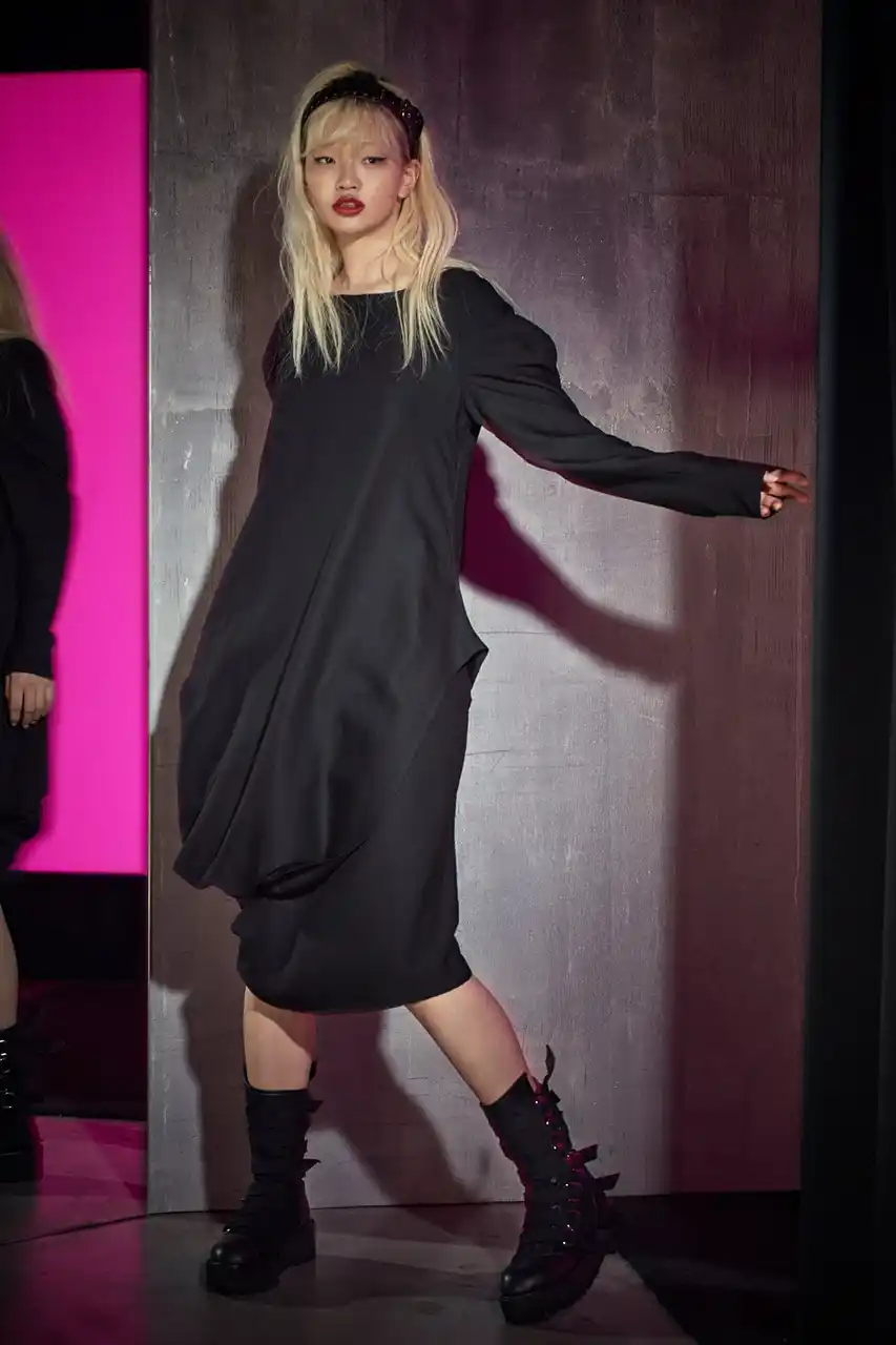 ストール付きワンピース、左肩にケープ、ボレロを着ているような後身頃のシルエット、脇ポケット、スカートは前後差のあるアシンメトリー、微光沢、ウールとキュプラのブレンド織り、 |