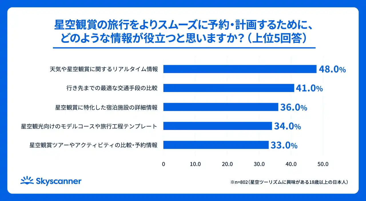星空が美しい場所は、都市部から離れたアクセスしにくい場所にあることも少なくありません。そのため、旅行者は航空券やレンタカー、公共交通機関といった多様な選択肢を、時間や費用といった観点から効率的に比較・検討したいと考えていることがうかがえます。 |