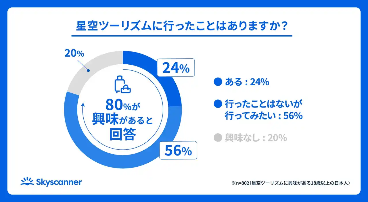 世界中の航空会社・旅行会社・ホテルなど約1,200のウェブサイトから最適な旅行プランを提供する” グローバル旅行アプリ” Skyscanner Japan株式会社(本社:東京都港区、以下スカイスキャナー)は、新たな旅行トレンドのインサイトを探るべく、全国の18歳以上の男女1,000人を対象に「星空ツーリズムに関する調査」を実施しました。 |