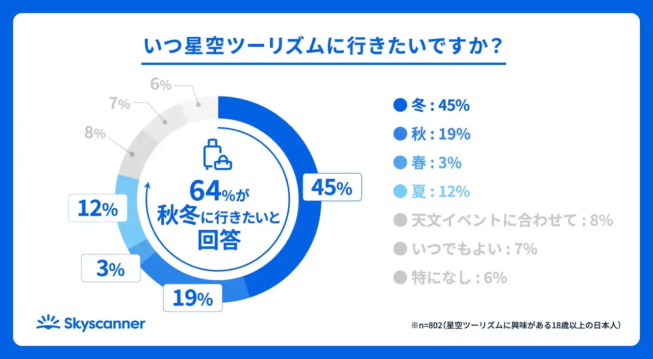 天体観測といえば夏のイメージが強いですが、「星空ツーリズムの最適な時期や季節はいつだと思いますか?」という質問をしたところ、65%が秋・冬と回答し夏を上回ると判明。空気が澄みわたり、一年で最も星の輝きが増す季節こそ、最高の体験をもたらすことを知る人が多いようです。 |