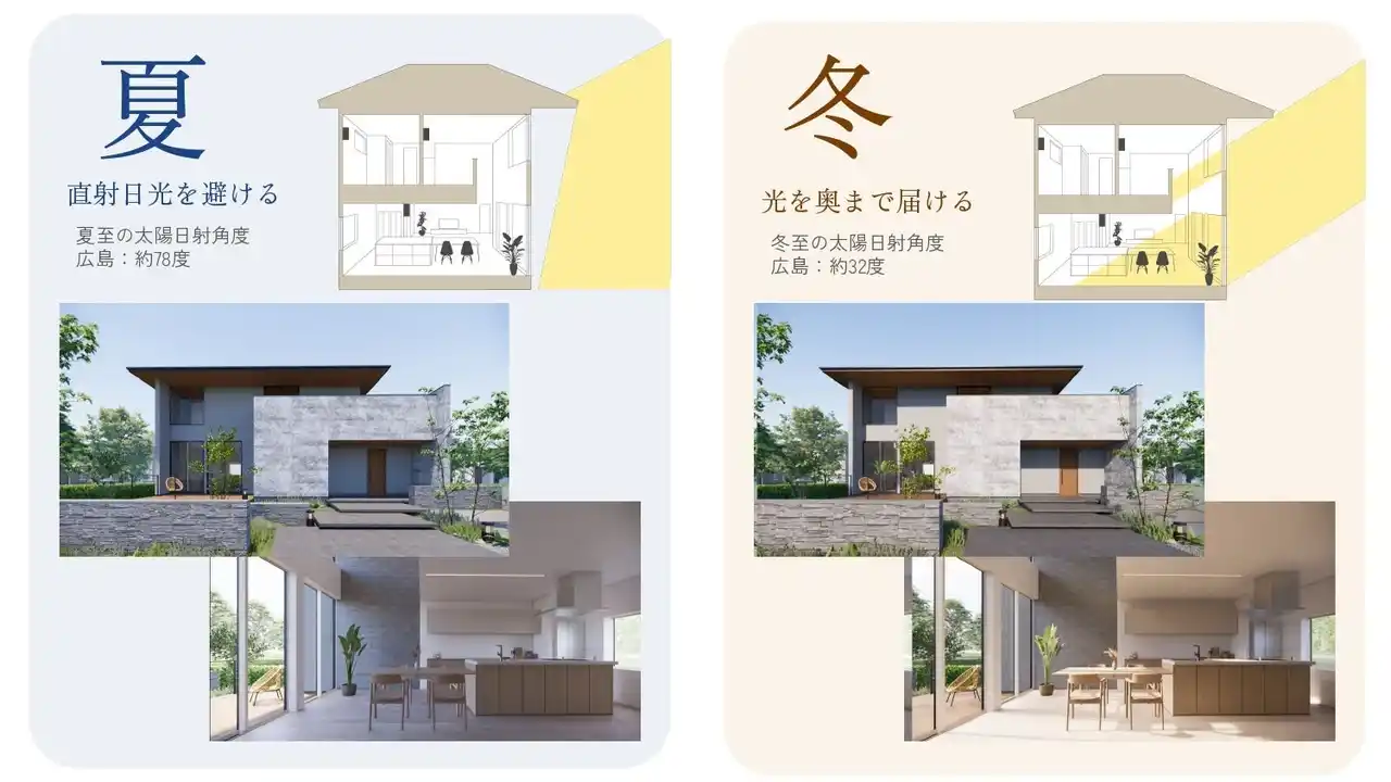 | 深い軒(のき)で夏の日差しを遮り、冬は暖かい陽光を室内に招き入れる。そんな自然の力を巧みに利用する思想を取り入れました。季節の移ろいを感じながら、エネルギー効率よく快適に暮らせる機能美をデザインに昇華させています。 | |||