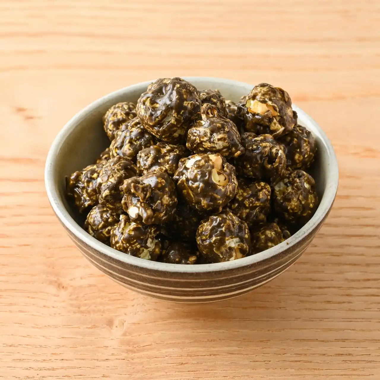 | 静岡県の山間地域で栽培された茶葉を使用した「天空のほうじ茶(R)」のポップコーン。 | |||