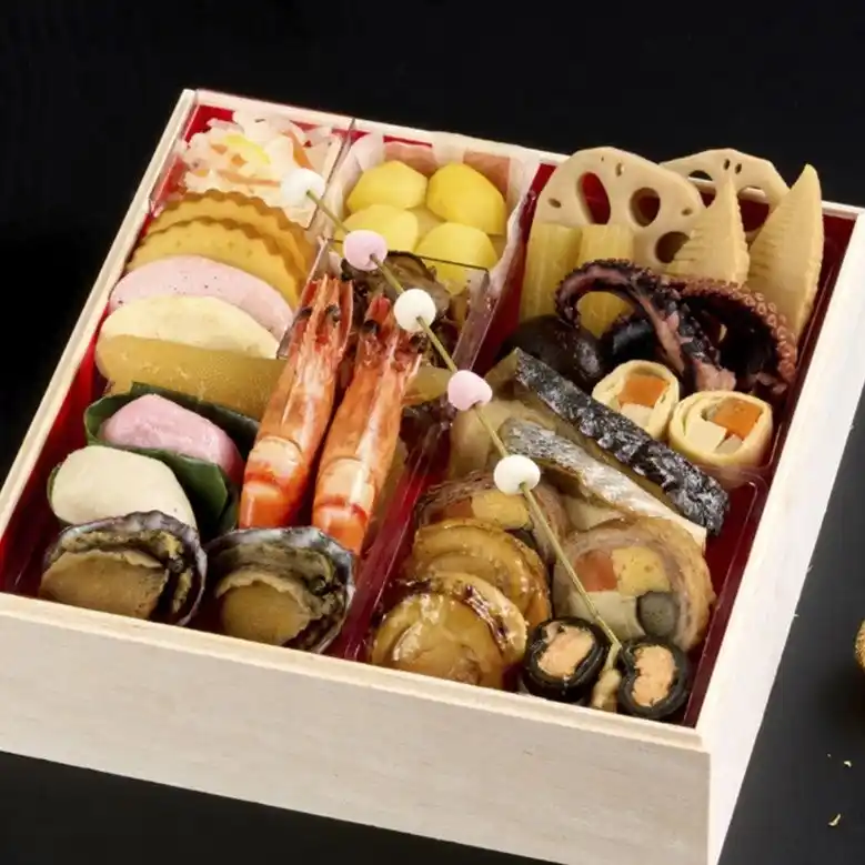 ~お品書き~ 上段(写真 右上) ◇高野豆腐と野菜の湯葉巻き ◇紅白なます ◇北海道産 いくら醤油漬け ◇田作り ◇数の子 ◇煮鮑 ◇蓮根 ◇煮蛸 ◇筍 ◇椎茸 ◇煮海老 ◇たたき牛蒡 ◇帆立山椒焼き ◇餅花飾り 下段(写真 左下) ◇柚子入り伊達巻き ◇湯葉入り紅白かまぼこ ◇鮭昆布巻き ◇あんぽ柿 ◇くるみの飴炊き ◇紅白笹麩まんじゅう ◇栗きんとん ◇黒豆 ◇牡蠣と湯葉の佃煮 ◇蟹と湯葉の蟹味噌和え ◇鰤柚庵焼き ◇蕗 ◇牛すき巻き |