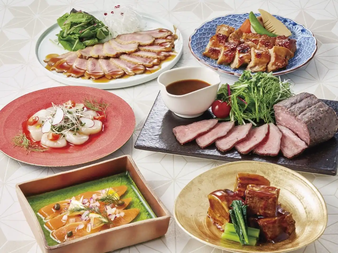 ~お品書き(写真 右上)~ ◇ローストビーフ(グレービーソース付き) ◇合鴨ロース煮 ◇豚角煮の黒酢あん ◇華味鳥の照り焼き ◇サーモンのオイル漬け ◇帆立のマリネ |