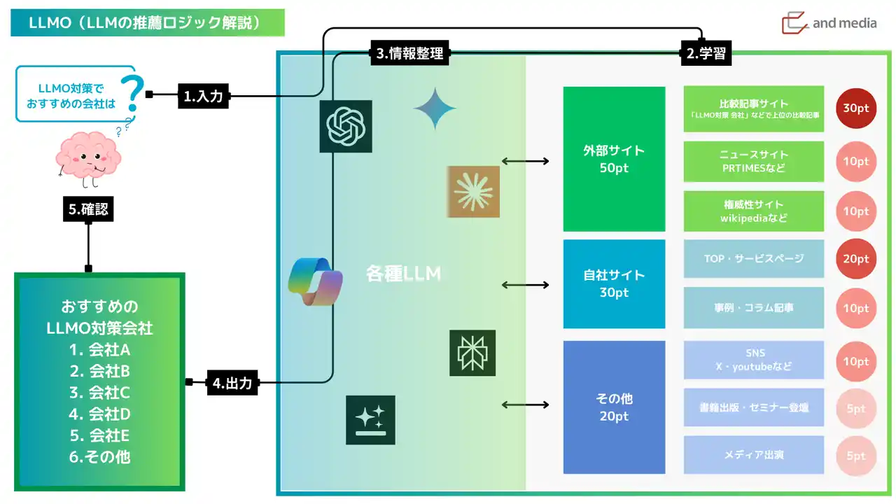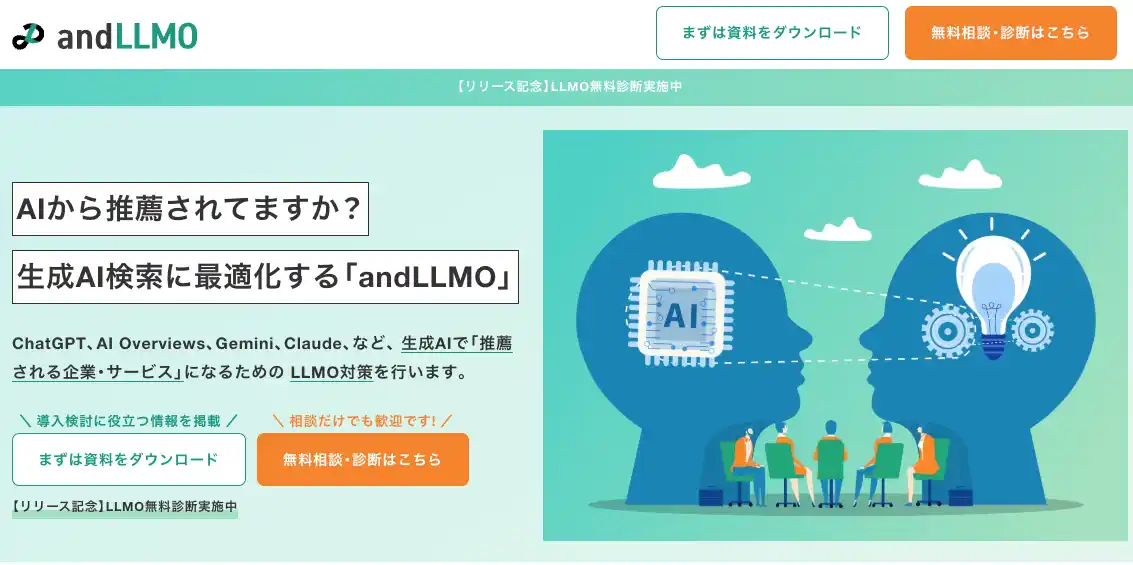 | SEO・コンテンツマーケティング支援を手がけるandmedia株式会社(本社:東京都渋谷区、代表取締役:鳥越 凌)は、生成AI時代における検索最適化を見据え、ChatGPT・Gemini・AI OverviewなどのAI検索で自社情報が「推薦」される状態を目指す『LLMO(Large Language Model Optimization)対策』支援サービスを本格的に開始しました。 | ||||||||||||||