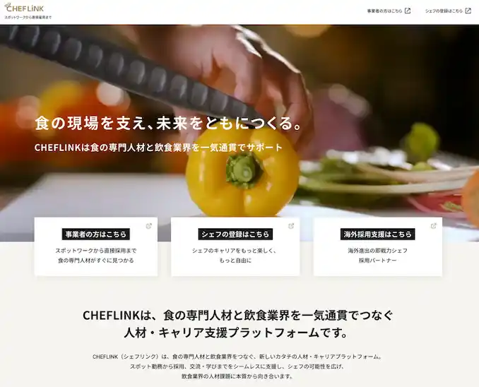 ※2025年8月、これまで提供してきた「CHEFLINK(キャリアサポートSNS)」と「SPOT CHEF(食の専門人材紹介サービス)」を統合し、より一貫した体験を届けるプラットフォームへと進化しました。 |