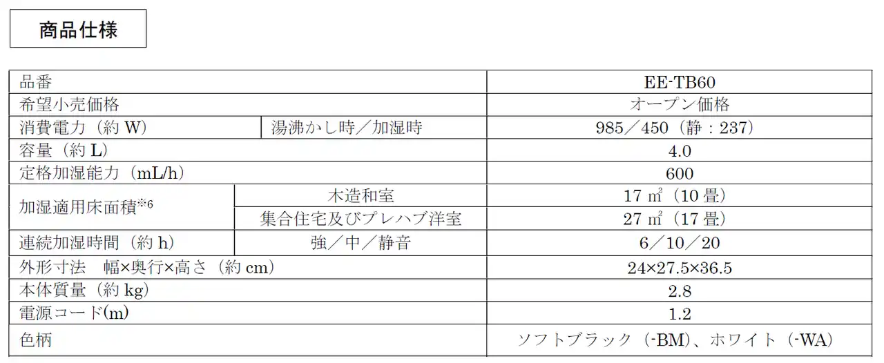 広いリビングでも使えるハイパワー加湿タイプ「EE-TB60」 |