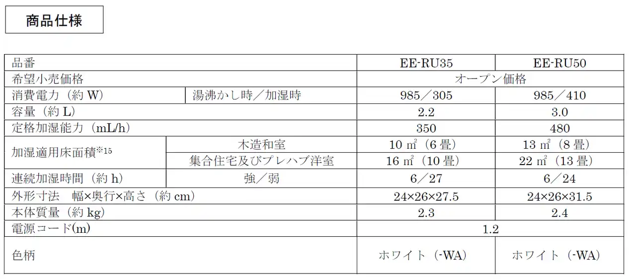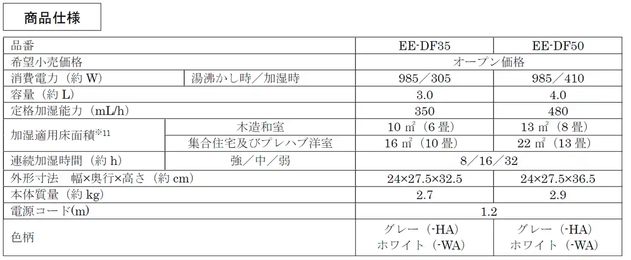 リビングや寝室で使いやすい長時間加湿タイプ「EE-DF35・50」 |