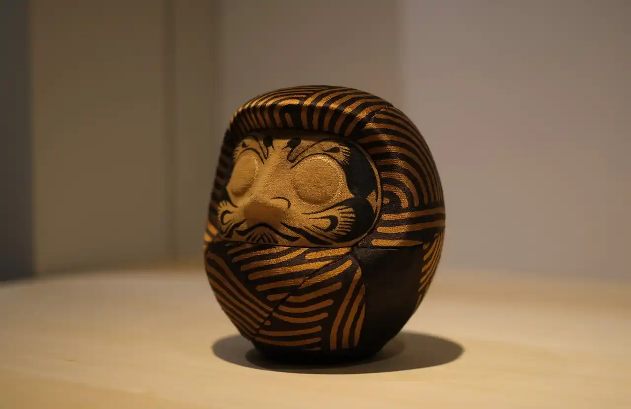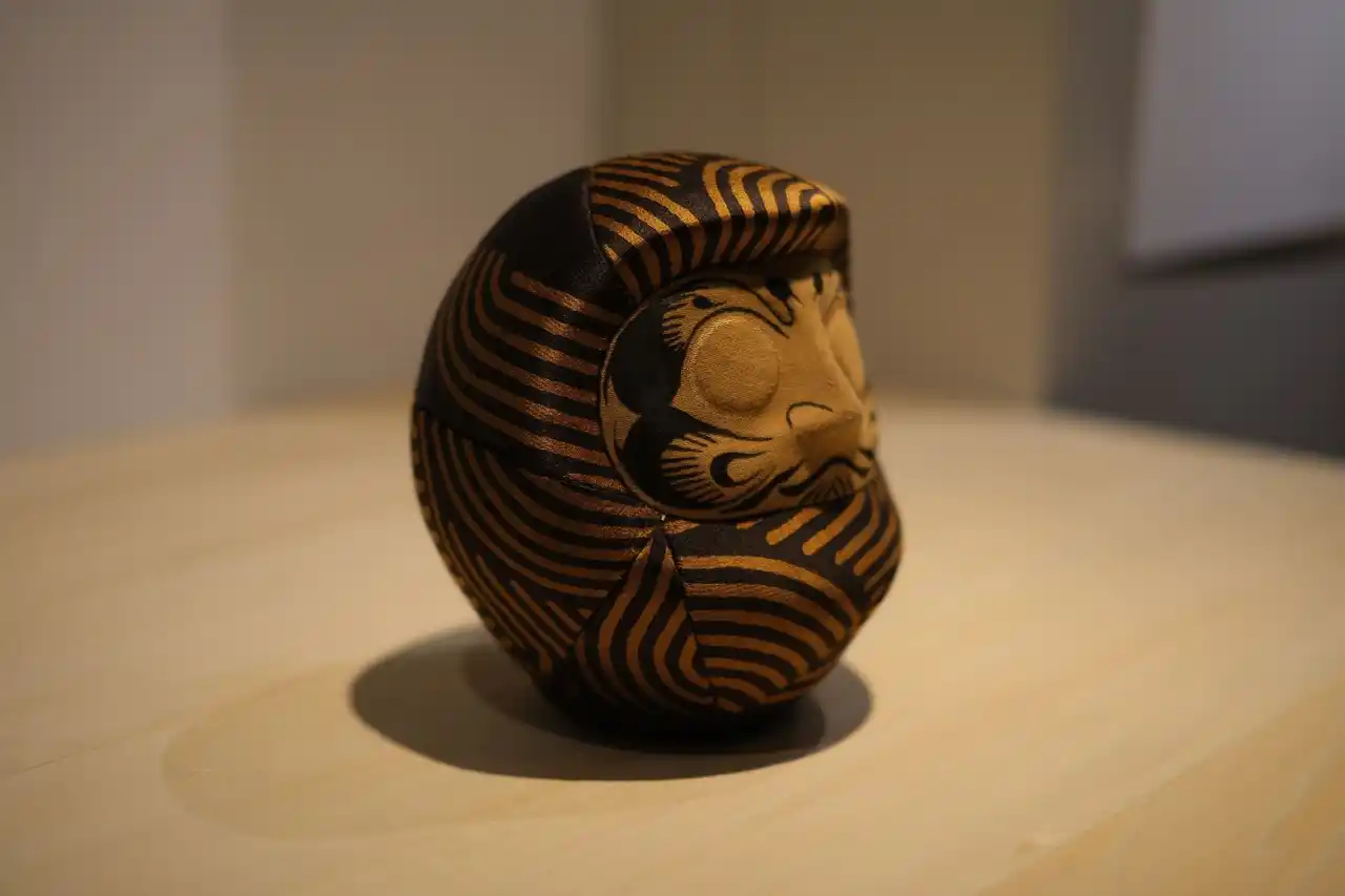 「だるまや和田清商店」のだるまから型を制作し、木目込にてお茶染め生地を着付けた作品。 |