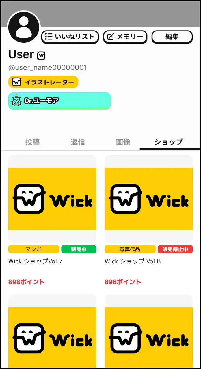 Wick公式ユーザーのユーザーページに「ショップ」タブが追加 |