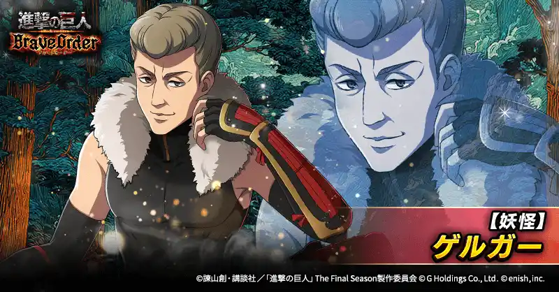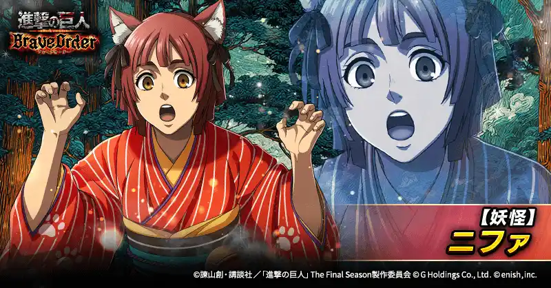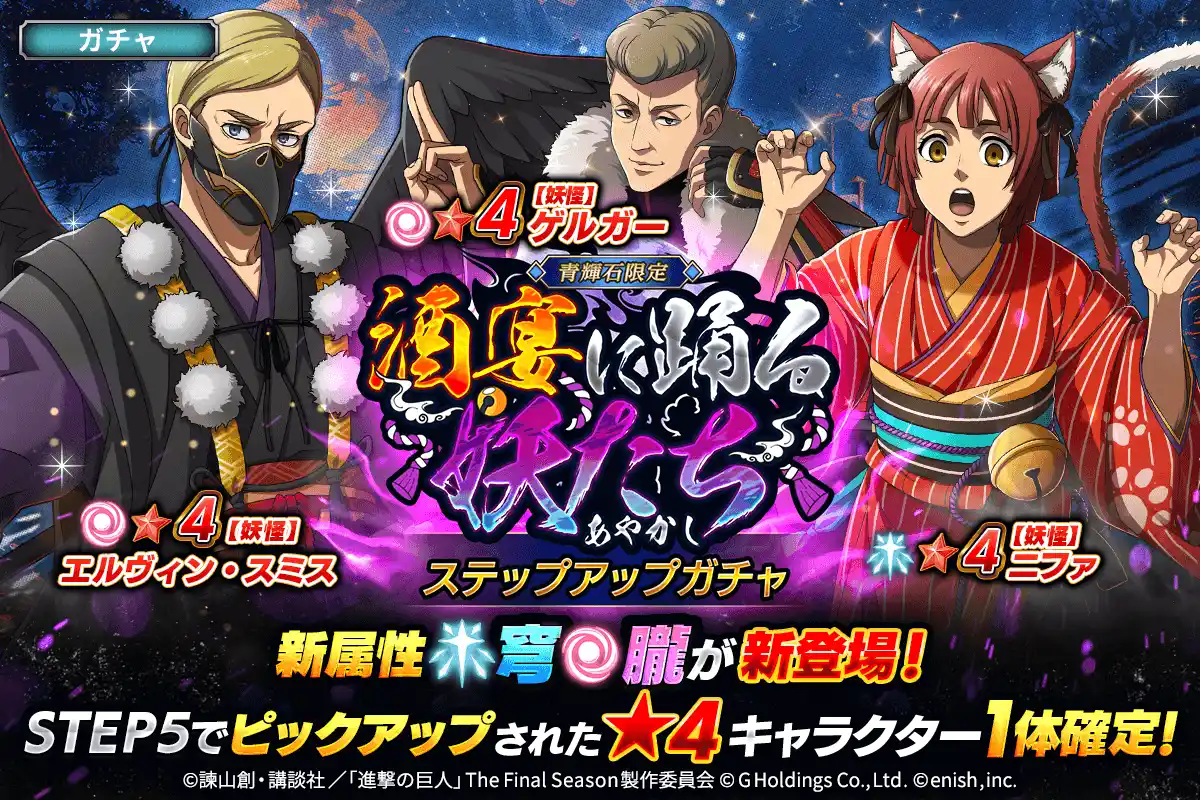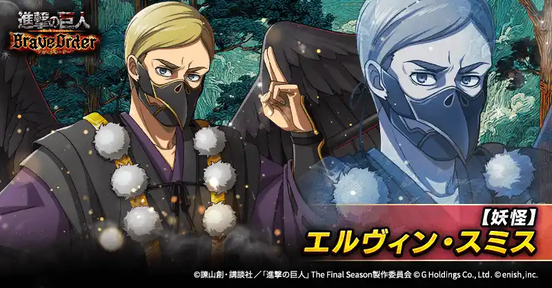 | 株式会社enish(本社:東京都港区、代表取締役社長:安徳 孝平、以下enish)は、アニメ『進撃の巨人』のスマートフォンゲーム最新作「進撃の巨人Brave Order」にて、2025年8月29日(金)より、新イベント「酒宴に踊る妖たち」を開催!また、本日より【妖怪】エルヴィン・スミス、【妖怪】ニファ、【妖怪】ゲルガーが新属性の朧&穹で登場する「酒宴に踊る妖たちガチャ」も開催!その他、最新情報はゲーム公式サイト・ゲーム公式X(旧Twitter)アカウントにて随時公開して行きますので、ぜひご覧ください。 | |||