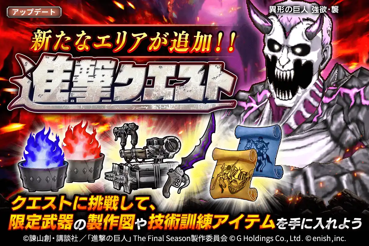 | 本日、2025年8月29日(金)より、進撃クエストに新たなエリアが追加!クエストに挑戦して限定武器の製作図や技術訓練アイテムを手に入れよう! | |||