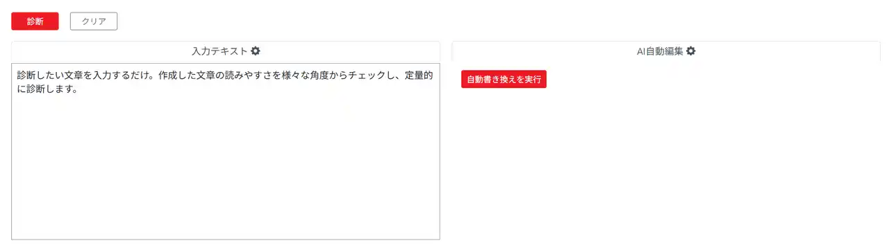 国際基準(ISOプレインランゲージ)の指標に沿った「日本語の読みやすさ診断機能」、「AIによる書き換え機能」を備え、直感的に理解・操作できるインターフェースで、あなたの文章作成をサポートします。 |