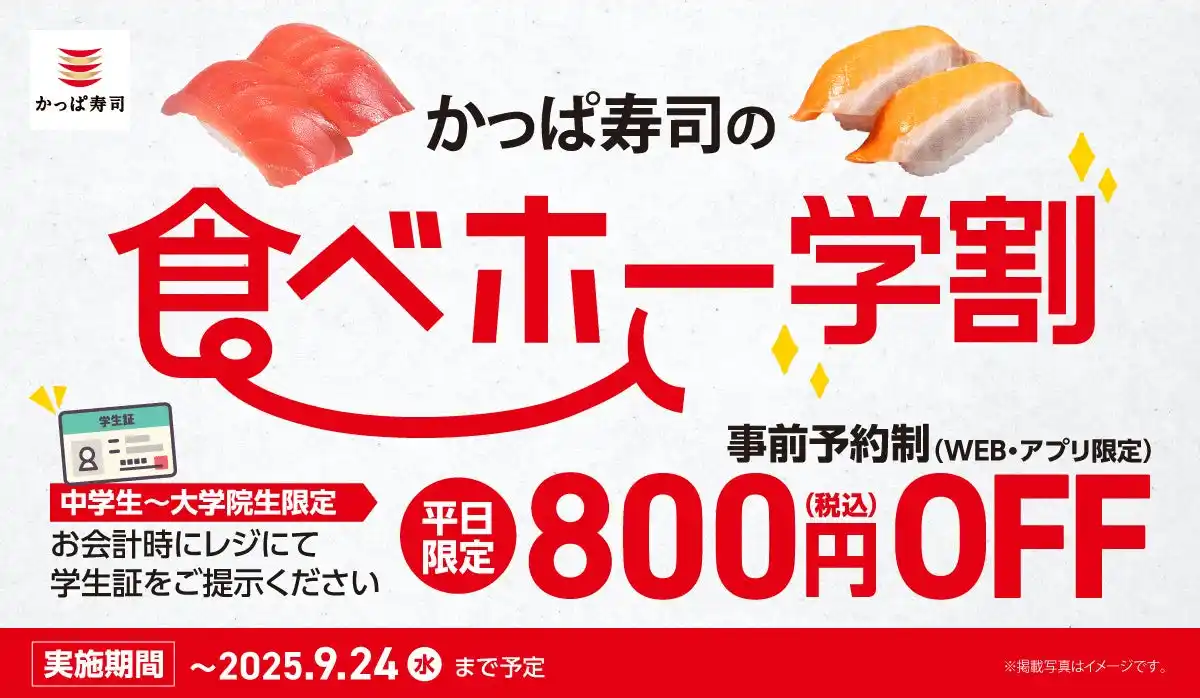 | 幼児無料!約100種類の食べ放題「かっぱ寿司の食べホー」本日8/29(金)より、かっぱ寿司公式アプリ・WEBにて受付開始!計179店舗で引き続き実施、平日学割も継続! |