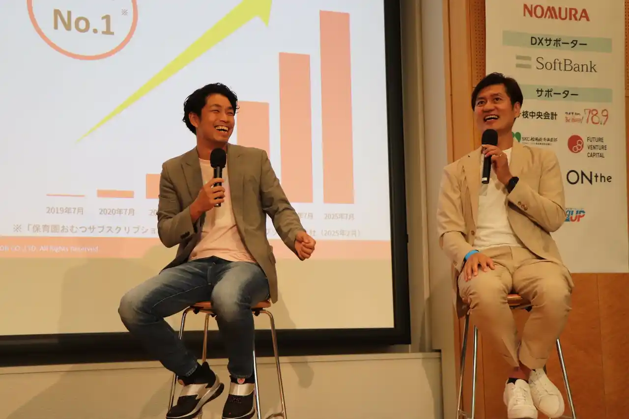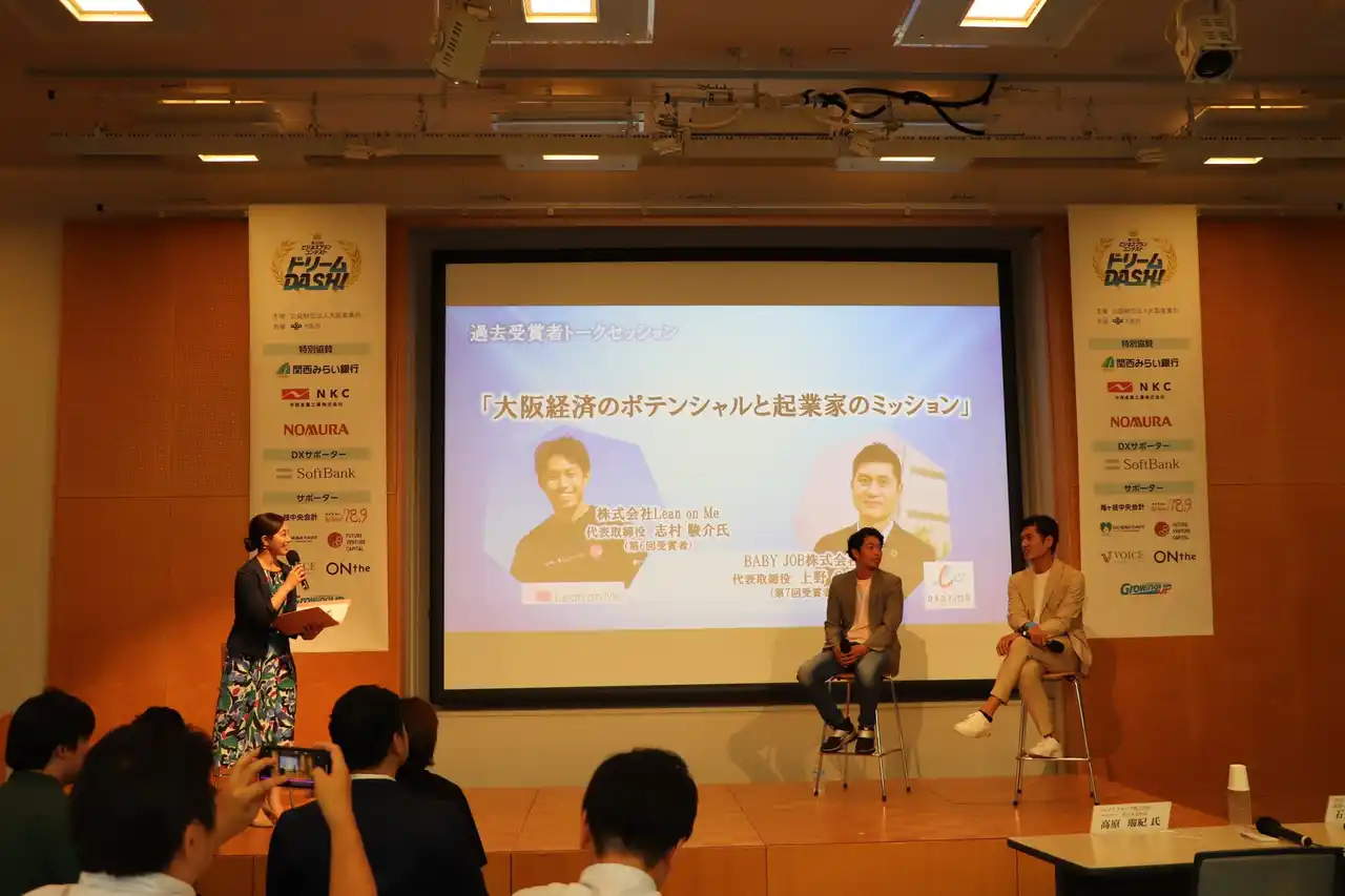 大阪・関西万博の開催にあたり、最終プレゼンテーション終了後、受賞者が決定するまでの審査時間を活用して、会場では過去の受賞者によるトークセッションを実施しました。ゲストには、大阪・関西万博でブース出展やサービス導入で参加した株式会社Lean on Me 代表取締役 志村 駿介氏(第6回受賞者)とBABY JOB株式会社 代表取締役 上野 公嗣氏(第7回受賞者)にご登壇いただき、起業間もない時に受賞してからの、9年間の事業成長の軌跡について、お話しいただきました。 |